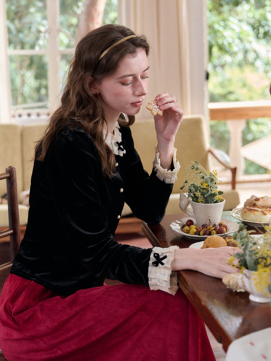 Azaria Round Collar Contrasting Lace Panel Bow Velvet Top - Black