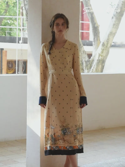- search_keywords: ["retro printed dress","deep apricot midi dress","V-neck long dress","print dress","Elizabeth dress"]