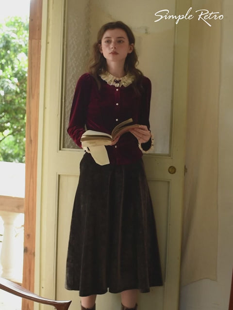 Azaria Round Collar Contrasting Lace Panel Bow Velvet Top - Red